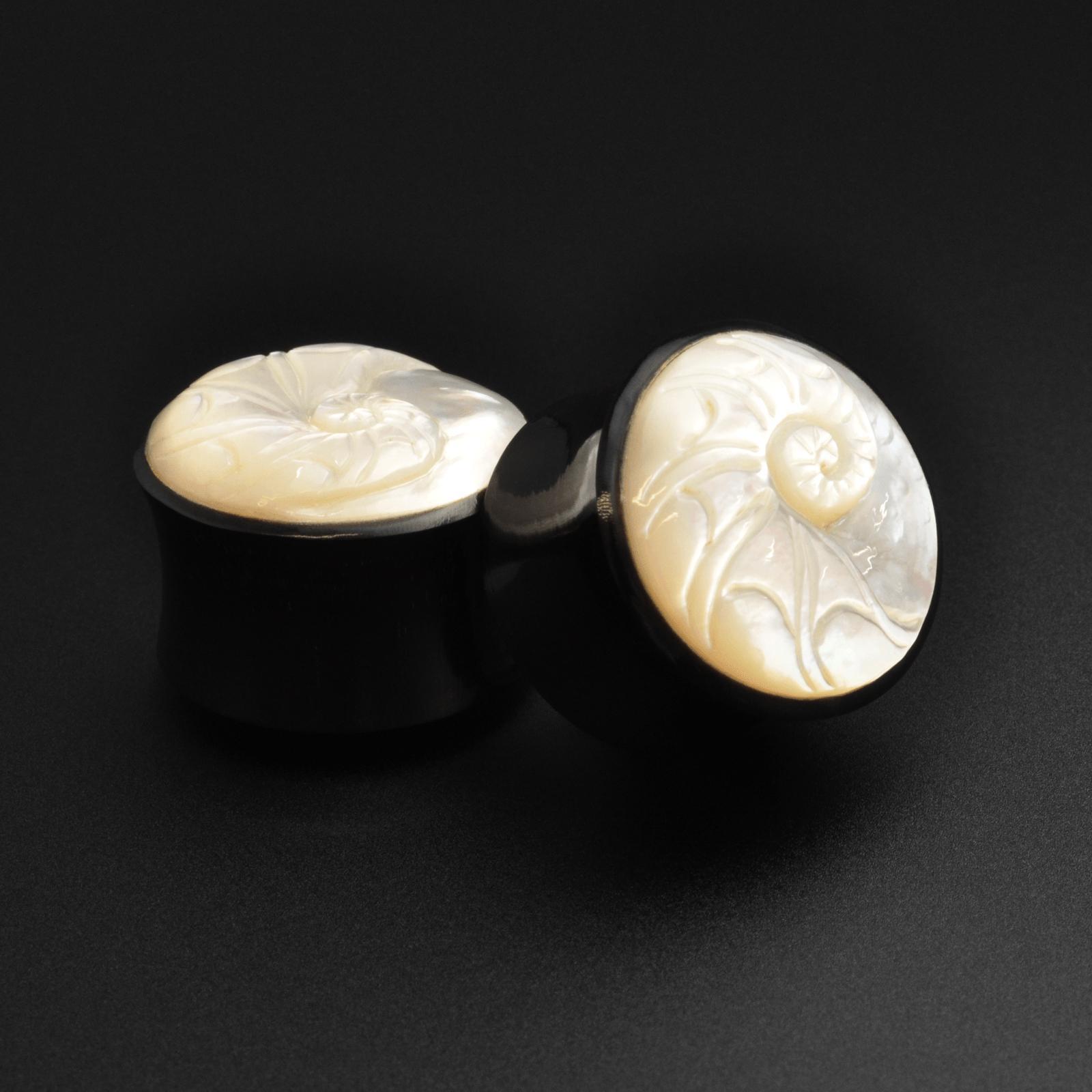 Horn Double Flare Plug With Ammonite MOP Carving Inlay Horn Double Flare Plug With Ammonite MOP Carving Inlay Model Shot
