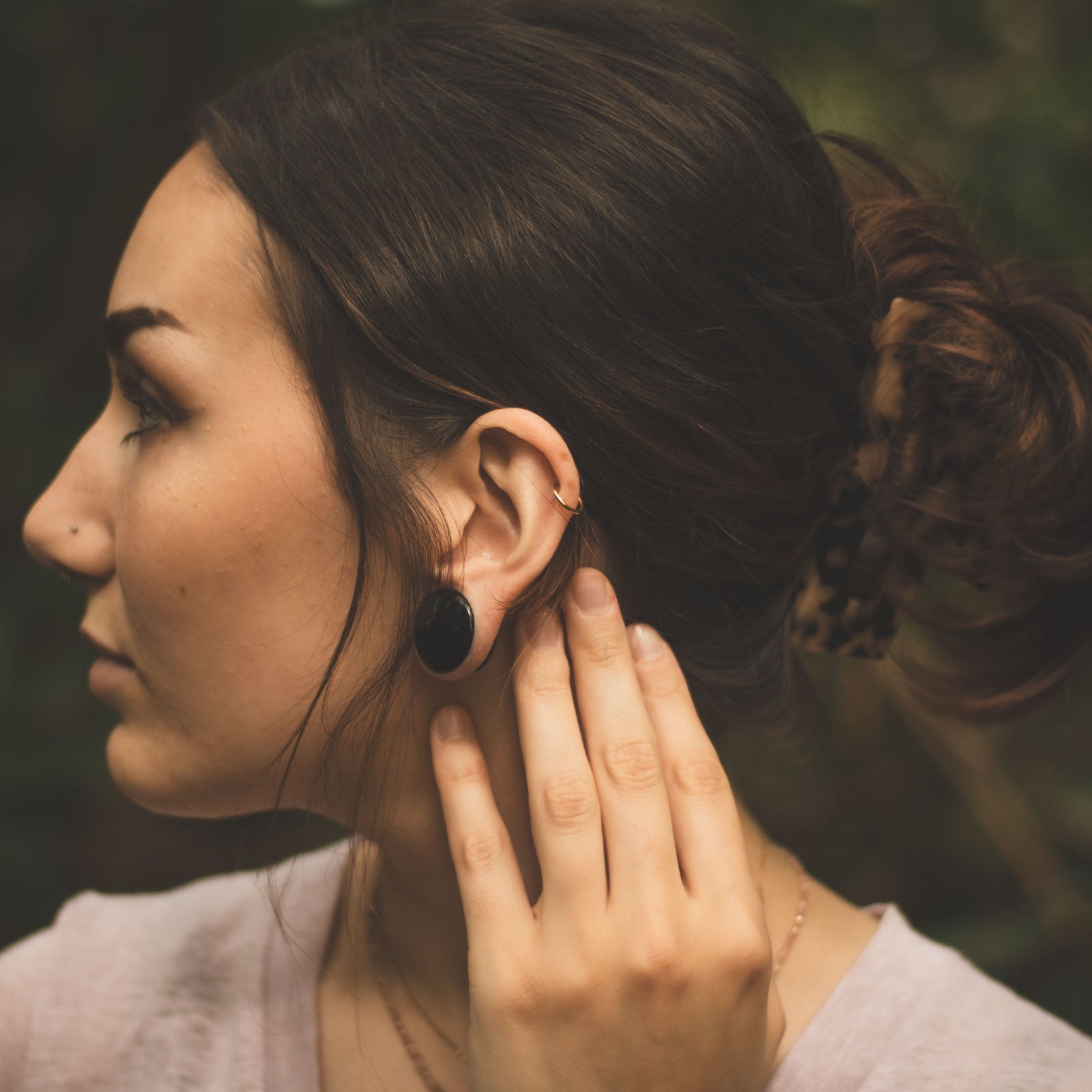 model wearing stone plugs