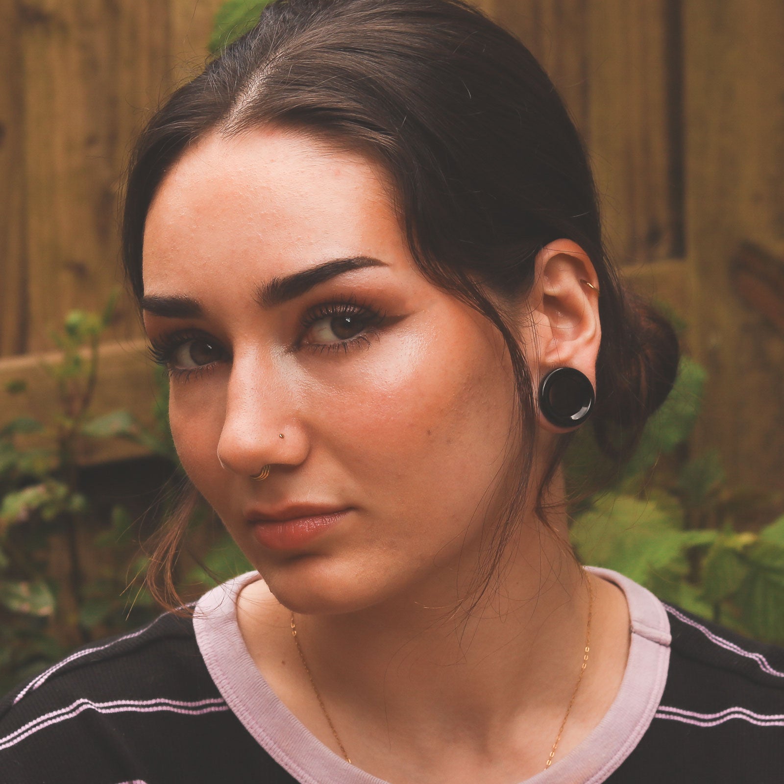 Black PVD Single Flare Tunnel model close up wearing 20mm black pvd ear gauges from stretch it body jewellery