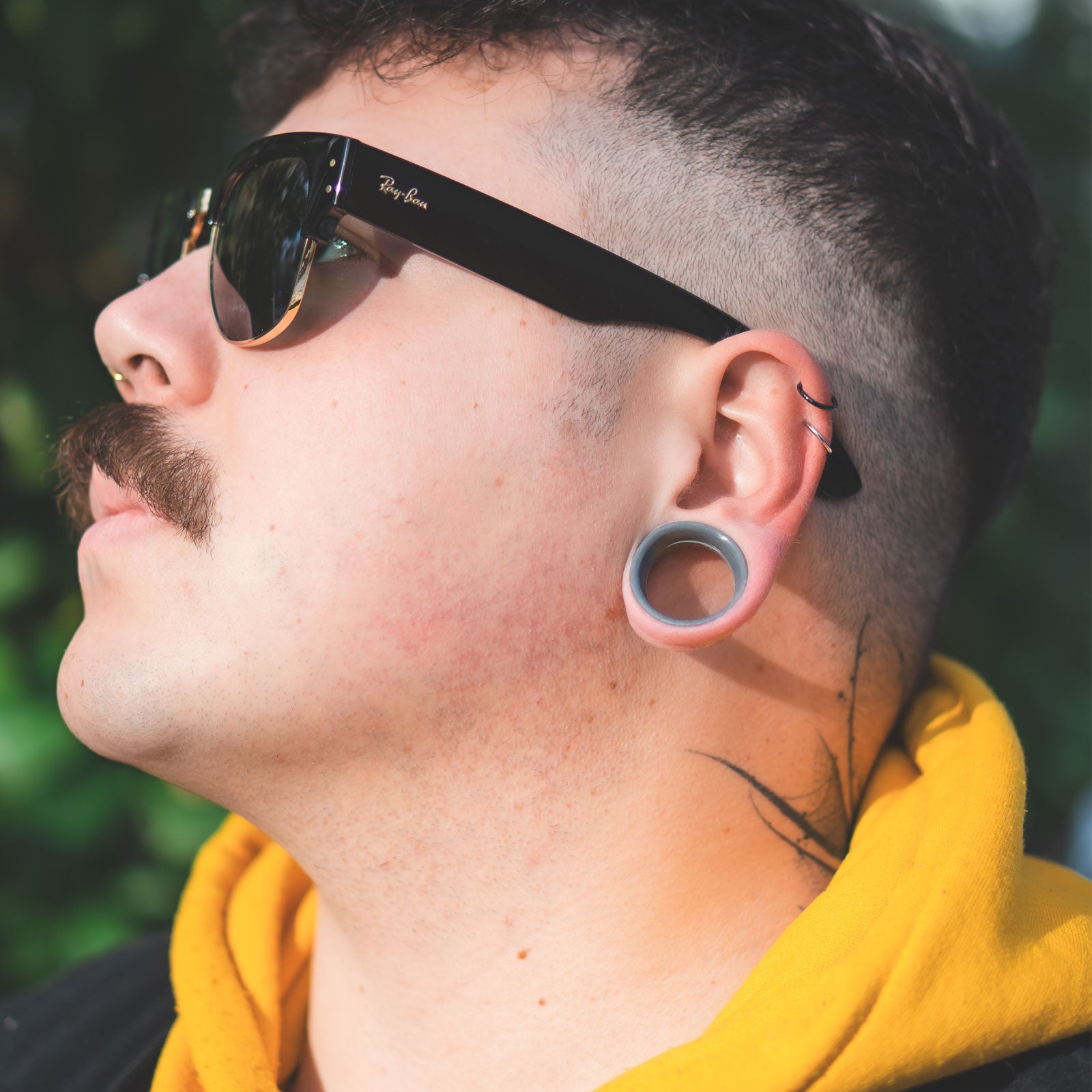 Gunmetal Grey Metallic Silicone Double Flare Tunnel Gunmetal Grey Metallic Silicone Double Flare Tunnel Model Shot