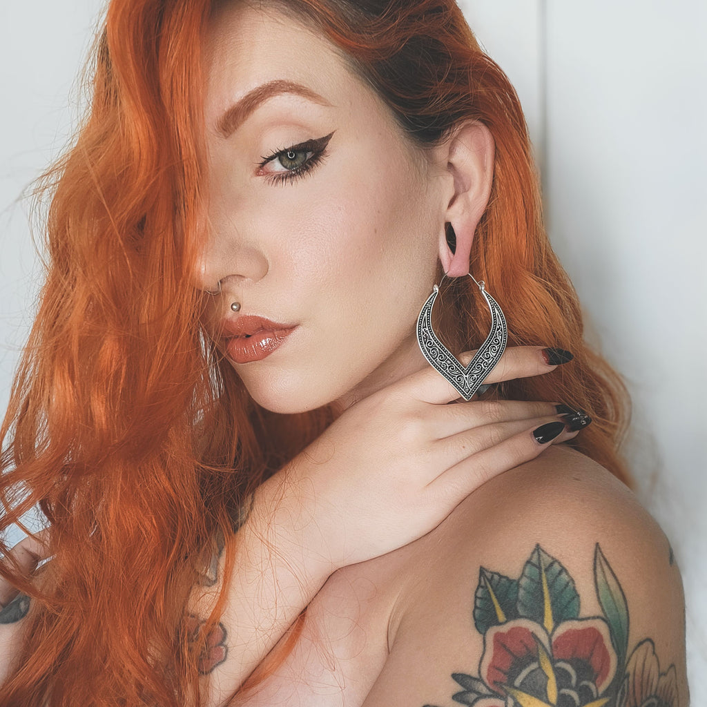 Tribal Swirl Antique Silver Plug Hoops Model Shot