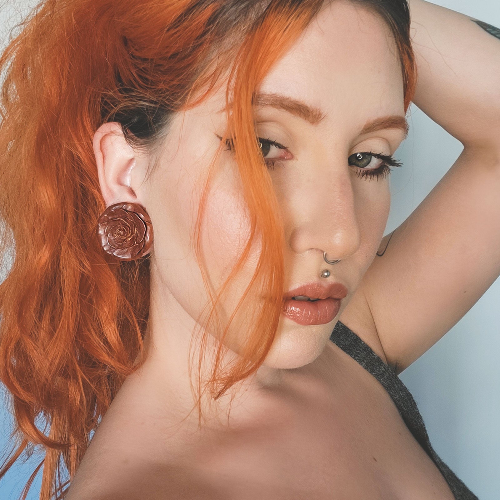 Saba Wood Double Flare Plug With Rose Bud Carving Saba Wood Double Flare Plug With Rose Bud Carving Model Shot