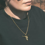 Bull Skull Brass Pendant With 18k Gold Box Chain Model Shot