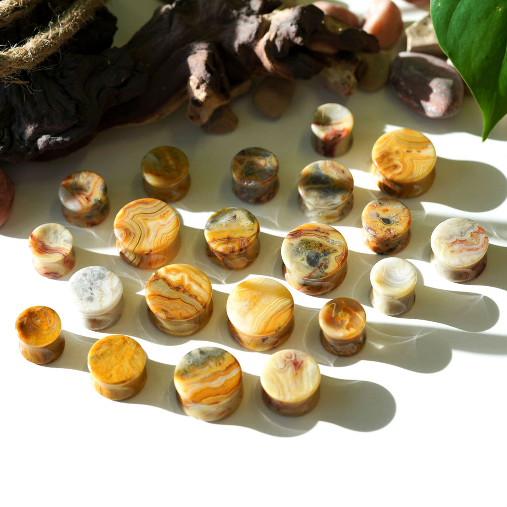 Crazy Lace Agate Double Flare Stone Plugs Groupshot