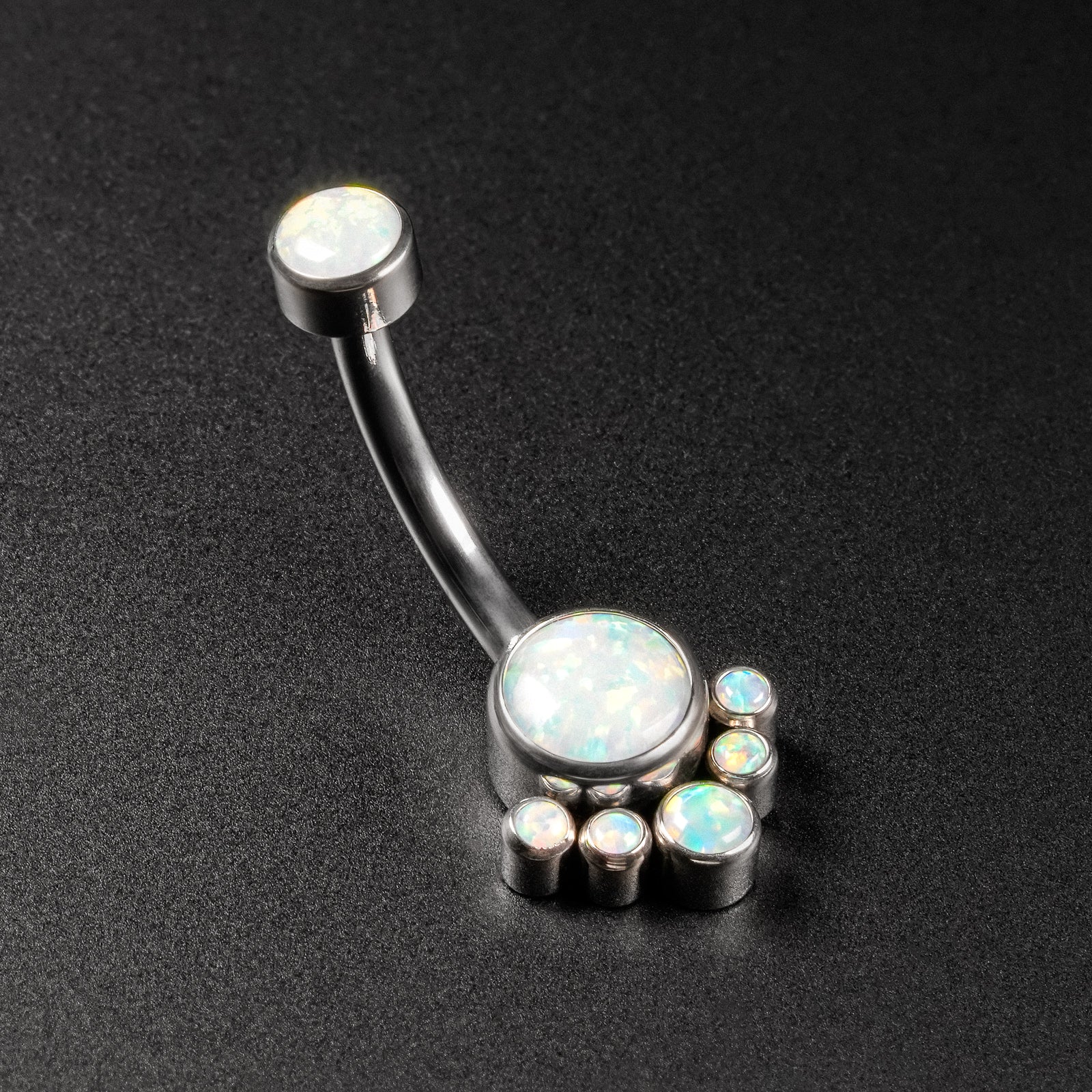 Double Fire & Snow Synth Opal Internally Threaded Titanium Belly Bar With Mini Opal Drop