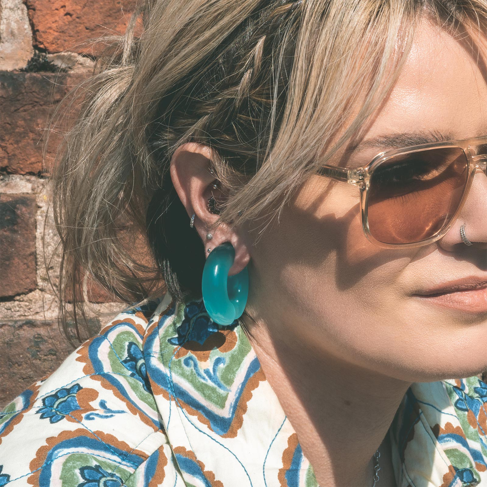 Aqua Cat's Eye Glass Ear Weight Model Shot Close Up