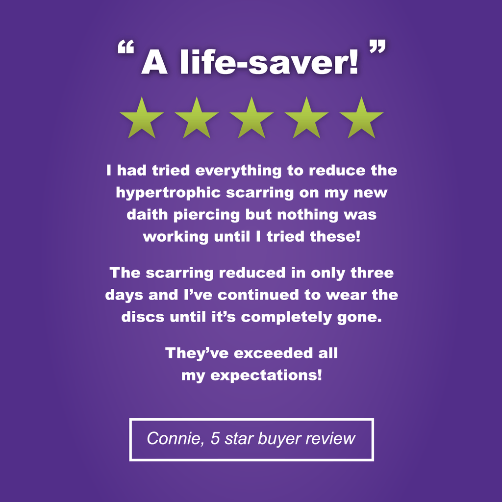 While it is common for the term piercing bump and keloid to be interchangeably used, they are not the same thing. Our discs will not work on a true keloid and we highly recommend you visit your doctor if you believe it to be a piercing keloid.