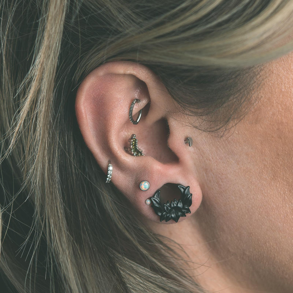 Embrace the beauty of the Lotus Flower with our exquisite Lotus Flower Black PVD Saddle Plug Ear Weight. Crafted from durable black PVD-coated surgical steel, these double flare (saddle) hangers are designed to take your ear stretching game to the next level.