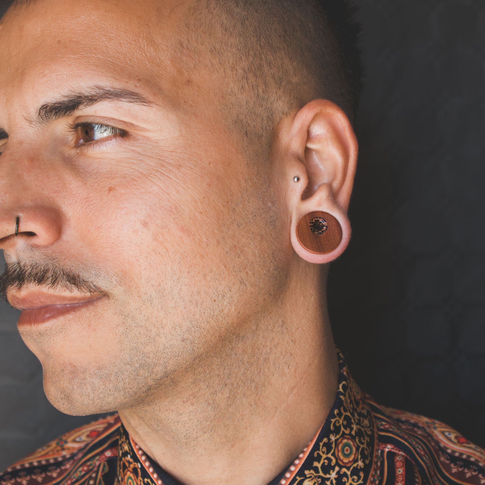 Saba Wood Double Flare Tunnel With Coconut Wood Offset Inlay Model Shot