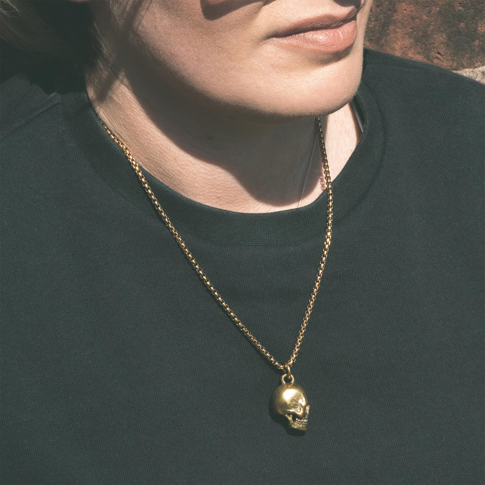 Skull Brass Pendant With 18k Gold Box Chain Model Shot