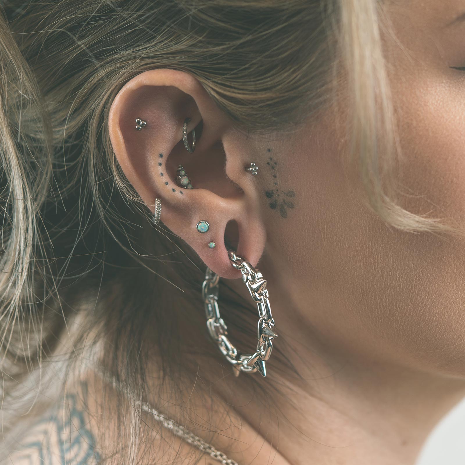 Spike Chain Hoop Surgical Steel Ear Weight Model Shot Close Up