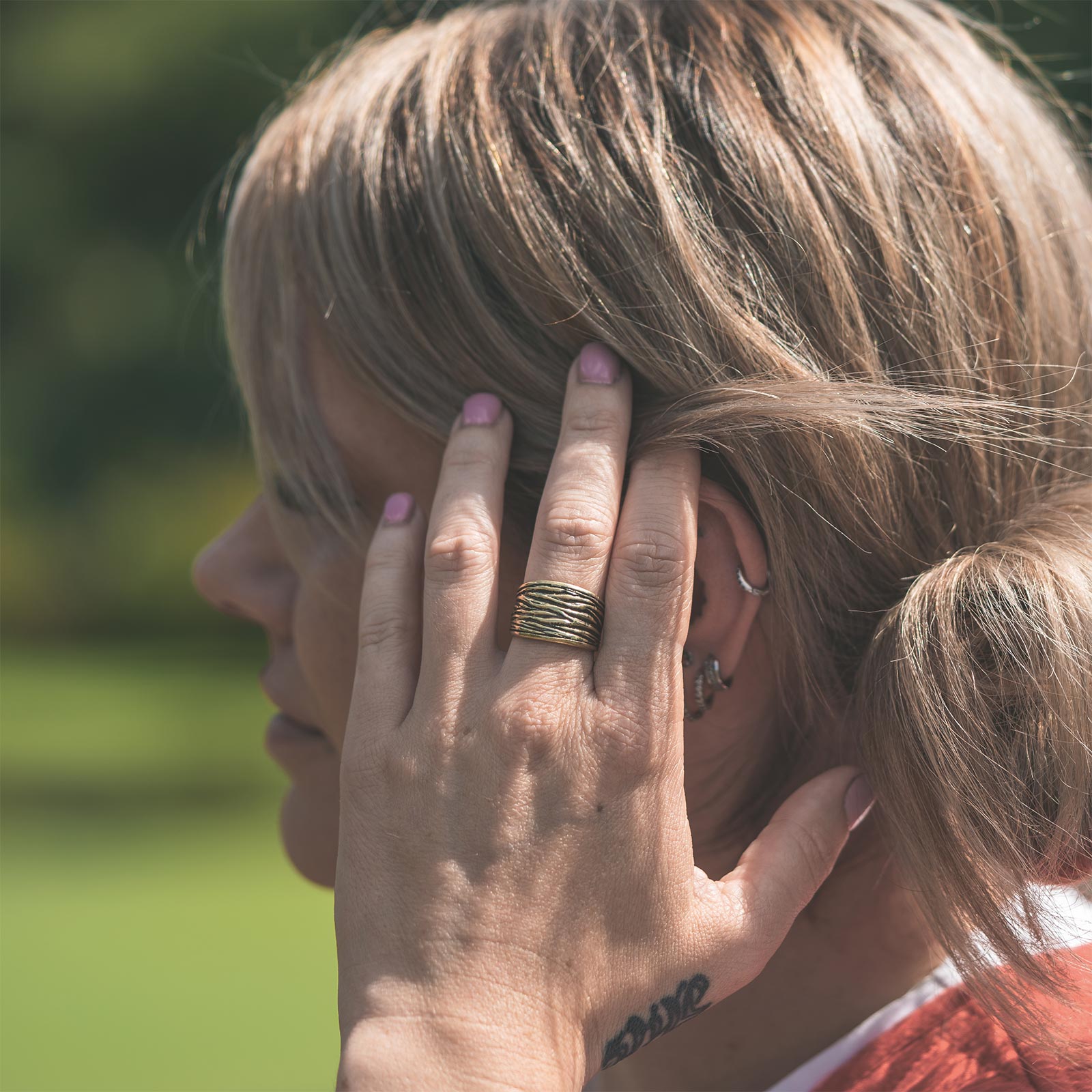 Textured Tree Bark Brass Ring Model Shot